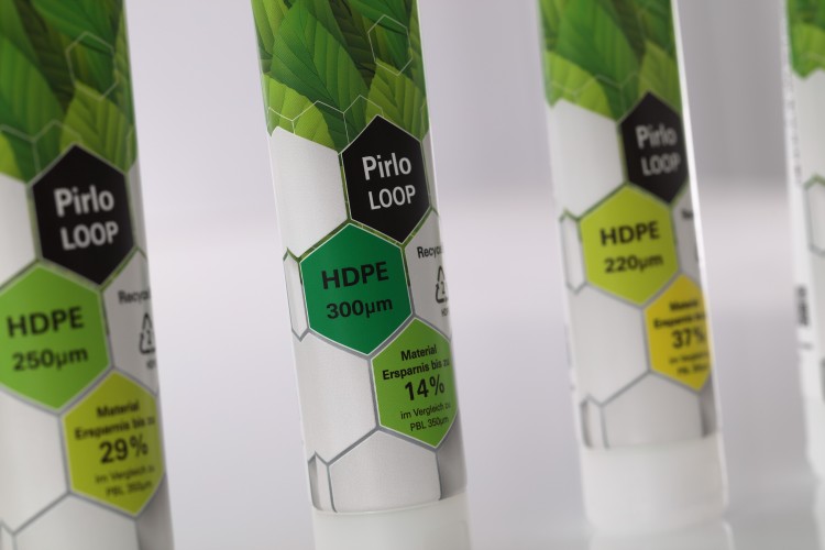 Od płaszcza tuby poprzez jej kołnierz aż do zakrętki - tuba Pirlo LOOP składa się w 100% z polietylenu, dzięki czemu wszystkie jej części składowe po zużyciu zawartości tuby można w pełni ponownie wprowadzić do zamkniętego obiegu HDPE. Tuba Pirlo LOOP dostępna jest w trzech grubościach materiału: 220 µm, 250 µm oraz 300 µm. Oszczędność tworzywa w porównaniu z tubą laminatową o grubości 350 µm wynosi: